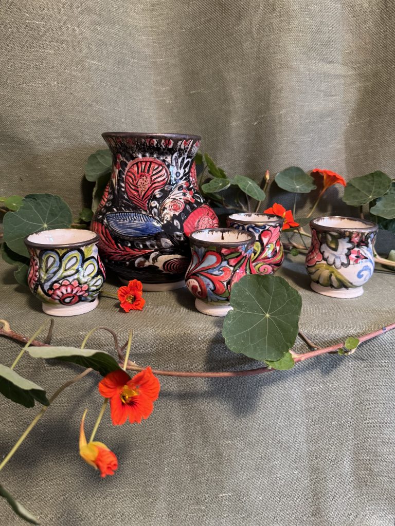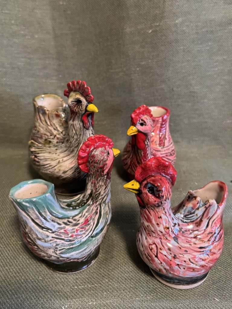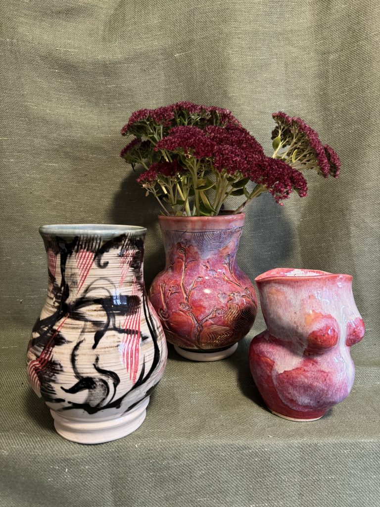 I like to use materials that are recycled or upcycled as much as possible, and in my work I also prefer to work with natural materials like wool, cotton, silk flowers and dried flowers, glass, wire, plaster, clay, and wood.